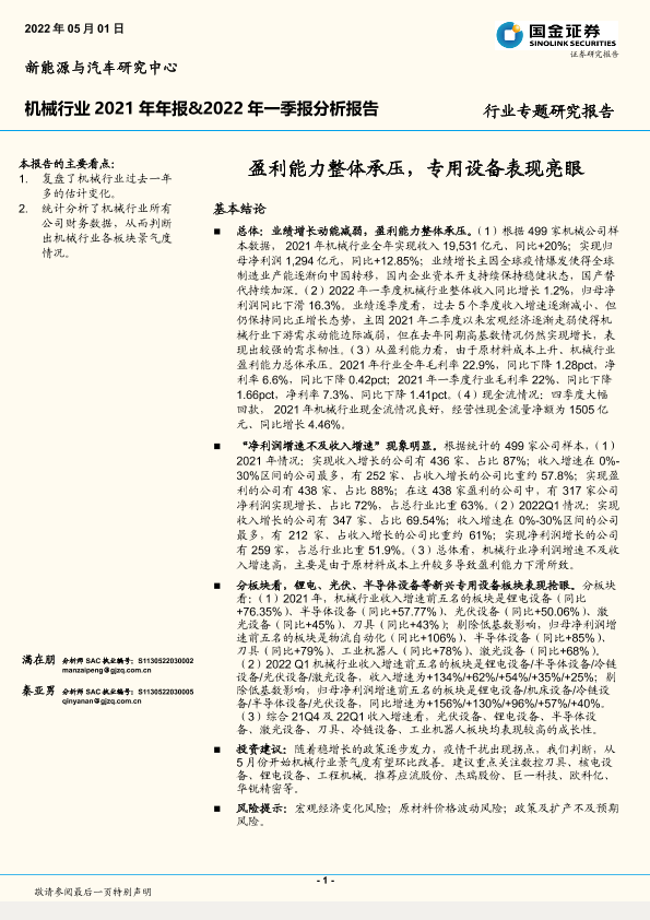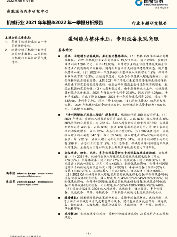 【国金证券】【20220501】机械行业2021年年报&2022年一季报分析报告:盈利能力整体承压,专用设备表现亮眼-18页