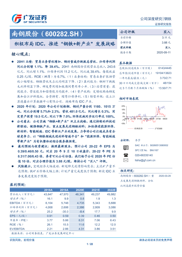 【广发证券】【20200911】南钢股份(600282.SH)积极布局IDC,推进“钢铁+新产业”发展战略-22页