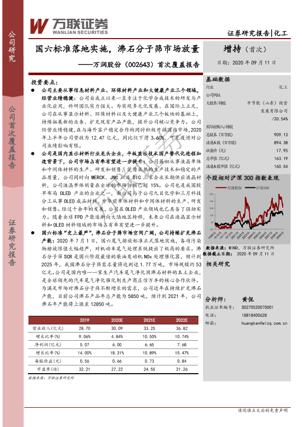 【万联证券】【20200911】20200911-万联证券-万润股份-002643.SZ-首次覆盖报告:国六标准落地实施,沸石分子筛市场放量-29页