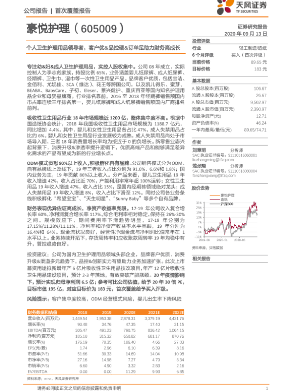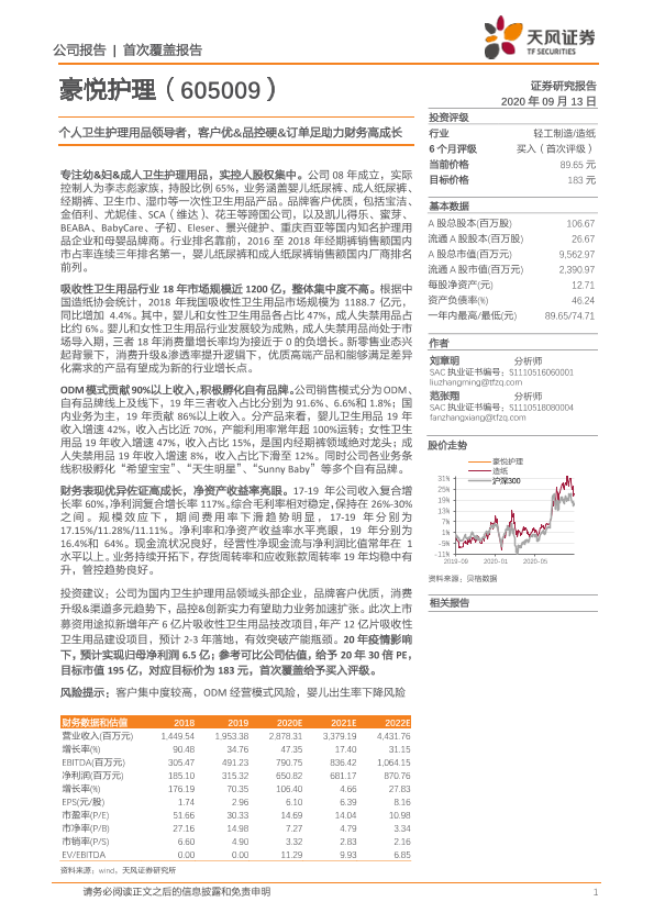 【天风证券】【20200913】豪悦护理-605009.SH-个人卫生护理用品领导者,客户优&品控硬&订单足助力财务高成长-20页
