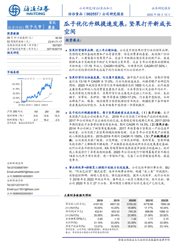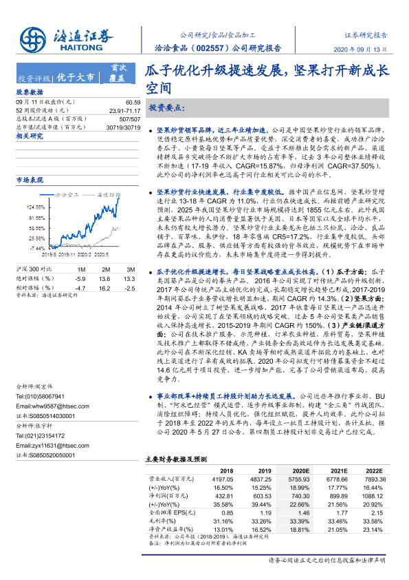 【海通证券】【20200913】洽洽食品-002557.SZ-公司研究报告:瓜子优化升级提速发展,坚果打开新成长空间-35页