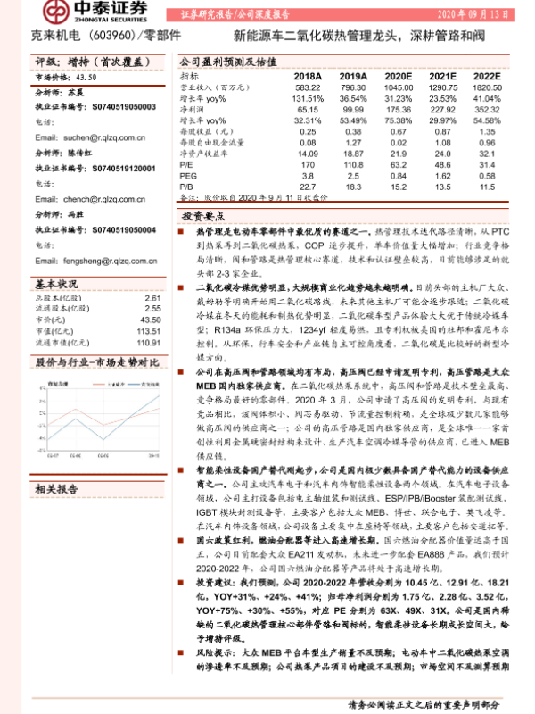 【中泰证券】【20200913】中泰证券-克来机电-603960.SH-新能源车二氧化碳热管理龙头,深耕管路和阀-22页