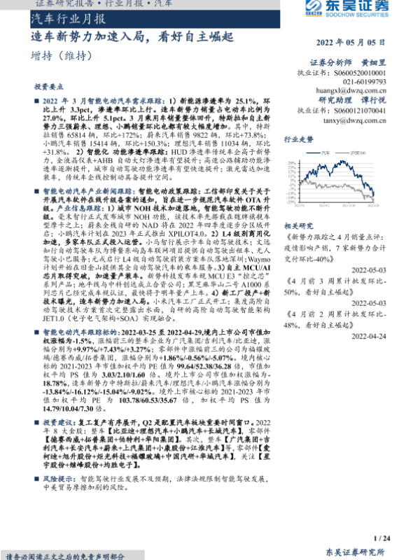【东吴证券】【20220505】汽车行业月报:造车新势力加速入局,看好自主崛起-24页