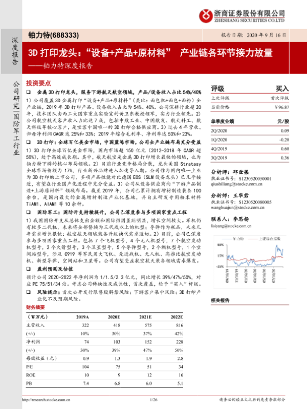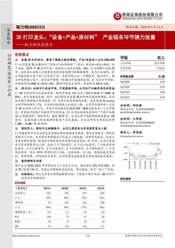 【浙商证券】【20200916】铂力特深度报告:3D打印龙头:“设备+产品+原材料” 产业链各环节接力放量-26页