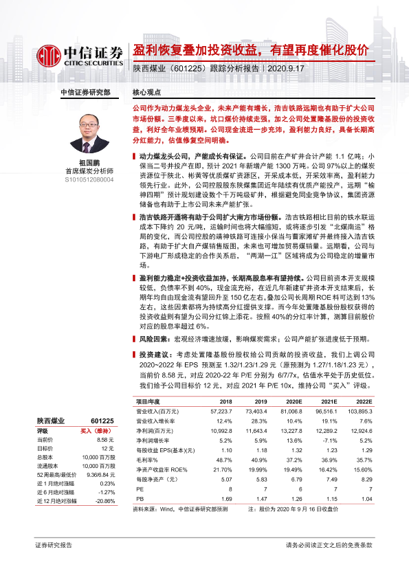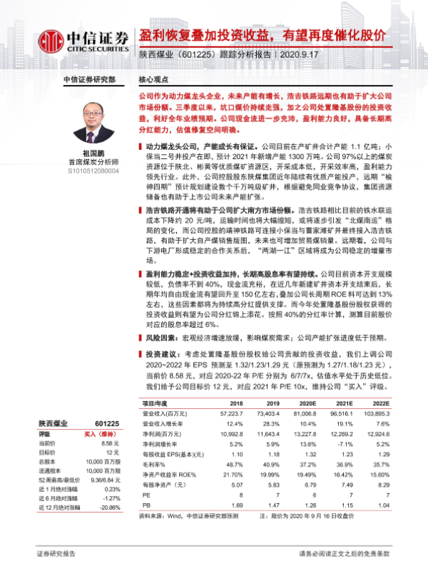 动力煤 投资收益 煤炭行业 股息率 陕西煤业