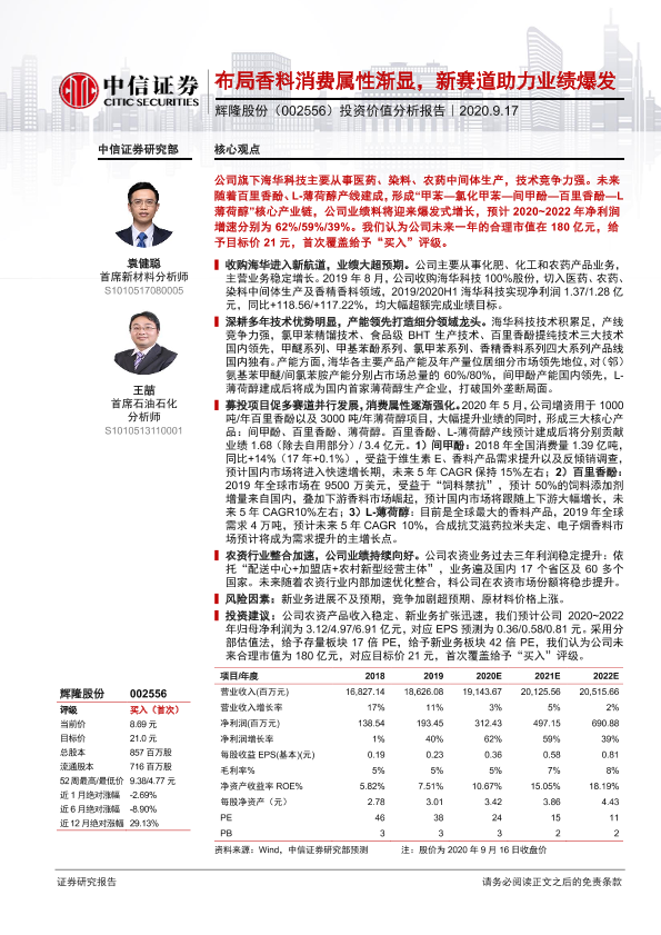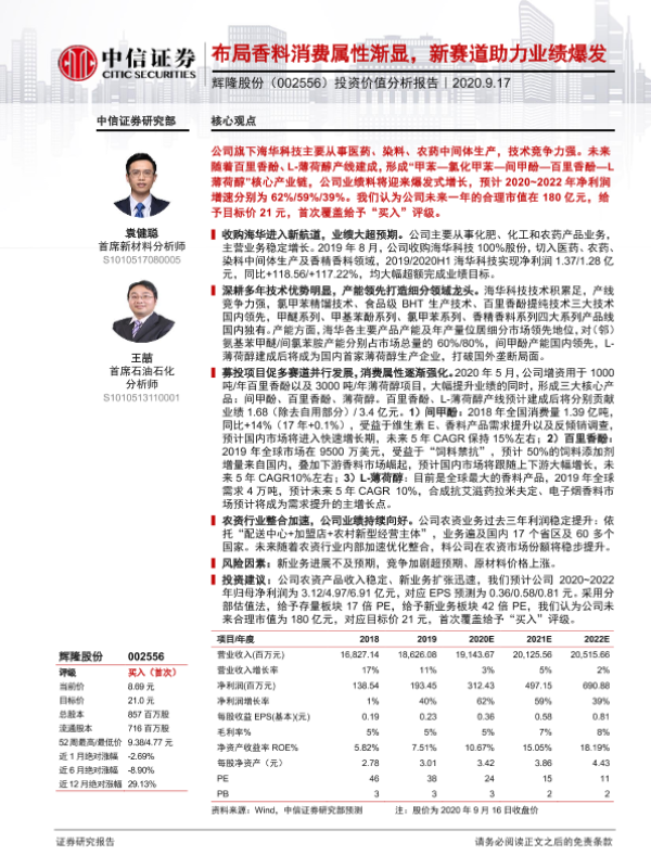 业绩预测 新赛道 精细化工 辉隆股份 香料消费