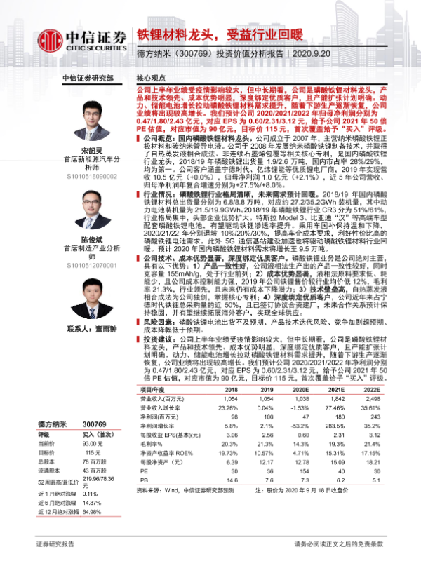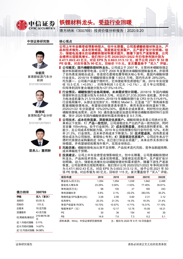 【中信证券】【20200920】德方纳米-300769.SZ-投资价值分析报告:铁锂材料龙头,受益行业回暖-25页