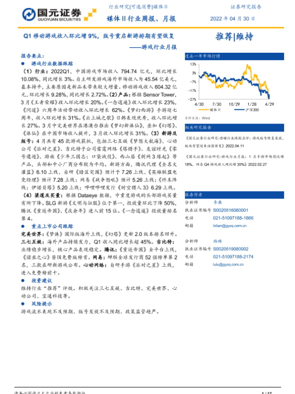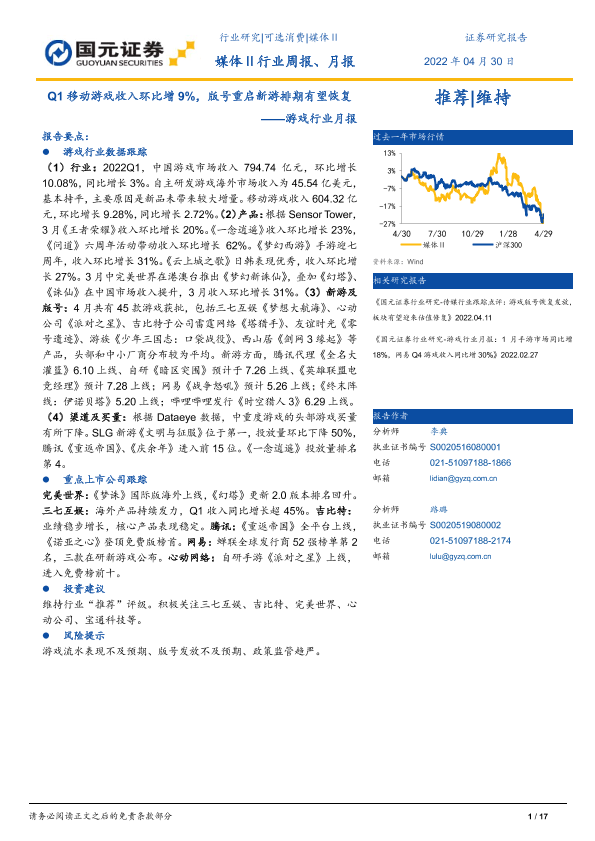 【国元证券】【20220430】游戏行业月报:Q1移动游戏收入环比增9%,版号重启新游排期有望恢复-17页
