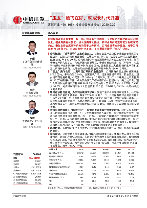 【中信证券】【20200922】20200922-中信证券-西部矿业-601168.SH-投资价值分析报告:“玉龙”腾飞在即,铜成长时代开启-28页