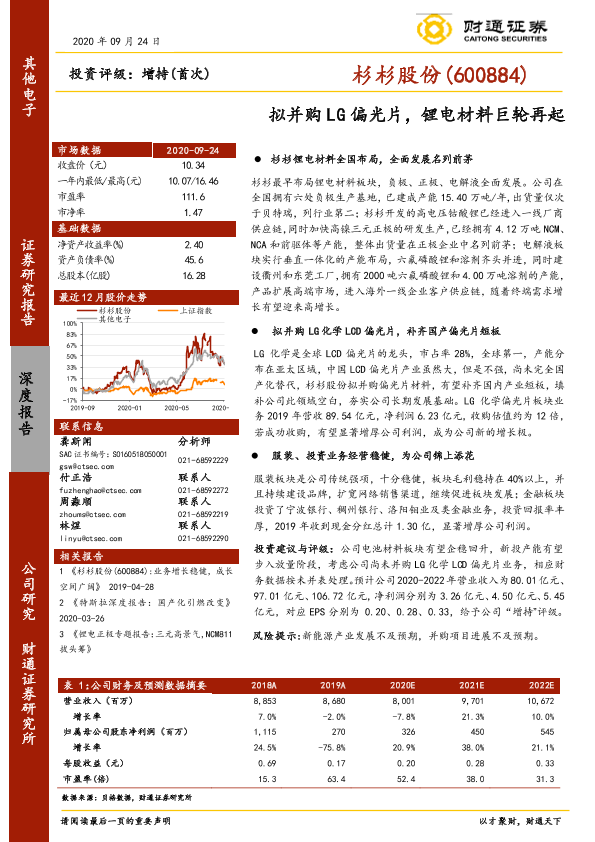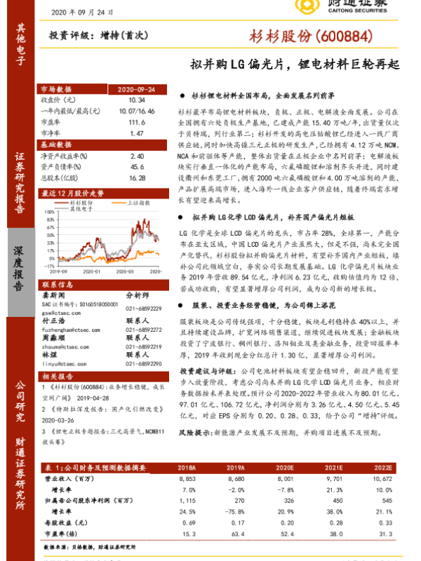 LG偏光片 并购 杉杉股份 财务预测 锂电材料