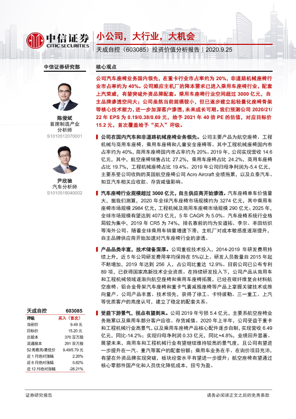 中信证券 天成自控 市场分析 投资价值 汽车座椅