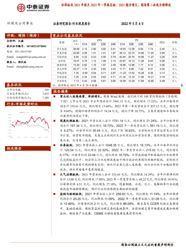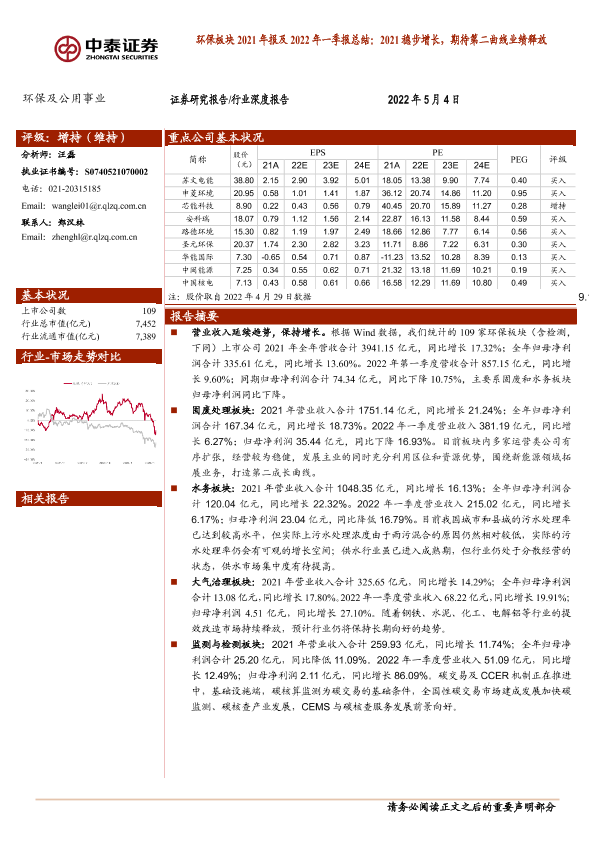 【中泰证券】【20220504】环保及公用事业行业环保板块2021年报及2022年一季报总结-23页