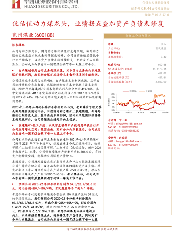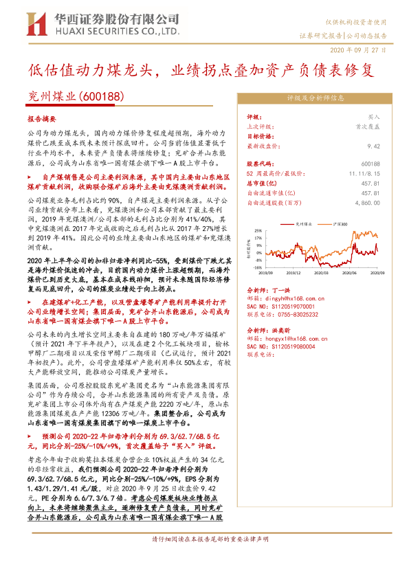 【华西证券】【20200927】20200927-华西证券-兖州煤业-600188.SH-低估值动力煤龙头,业绩拐点叠加资产负债表修复-20页