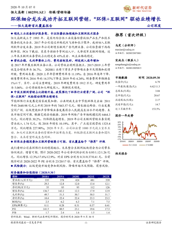 【新时代证券】【20201007】恒大高新首次覆盖报告:环保细分龙头成功开拓互联网营销,“环保+互联网”驱动业绩增长-23页