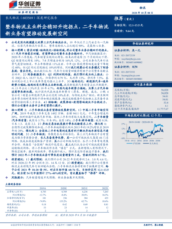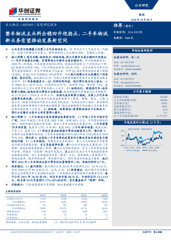 【华创证券】【20201008】长久物流-603569.SH-深度研究报告:整车物流主业料企稳回升迎拐点,二手车物流新业务有望推动发展新空间-25页