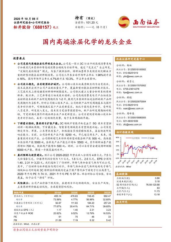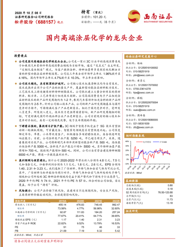 【西南证券】【20201008】20201008-西南证券-松井股份-688157.SH-国内高端涂层化学的龙头企业-32页