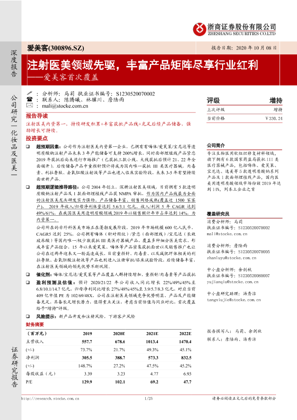【浙商证券】【20201008】爱美客首次覆盖:注射医美领域先驱,丰富产品矩阵尽享行业红利-25页