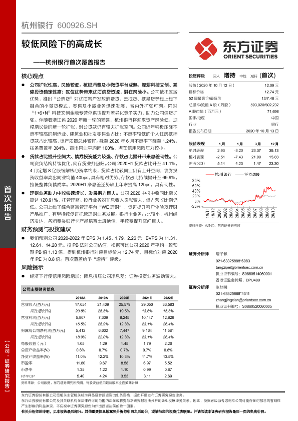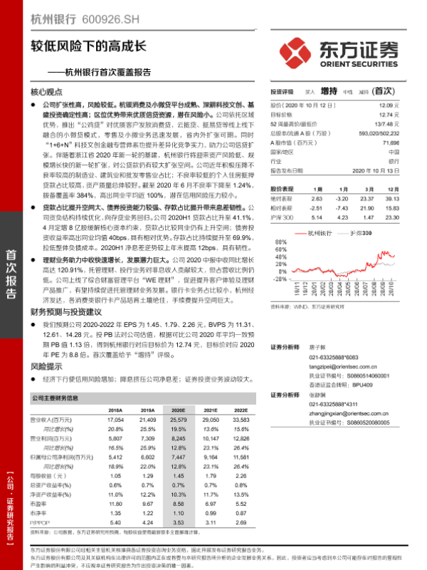 【东方证券】【20201013】杭州银行首次覆盖报告:较低风险下的高成长-24页