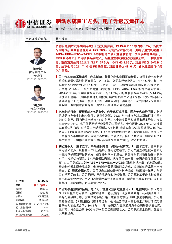 【中信证券】【20201012】20201012-中信证券-伯特利-603596.SH-投资价值分析报告:制动系统自主龙头,电子升级放量在即-37页