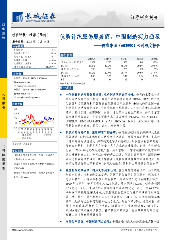 【长城证券】【20201014】20201014-长城证券-健盛集团-603558.SH-公司深度报告:优质针织服饰服务商,中国制造实力凸显-30页