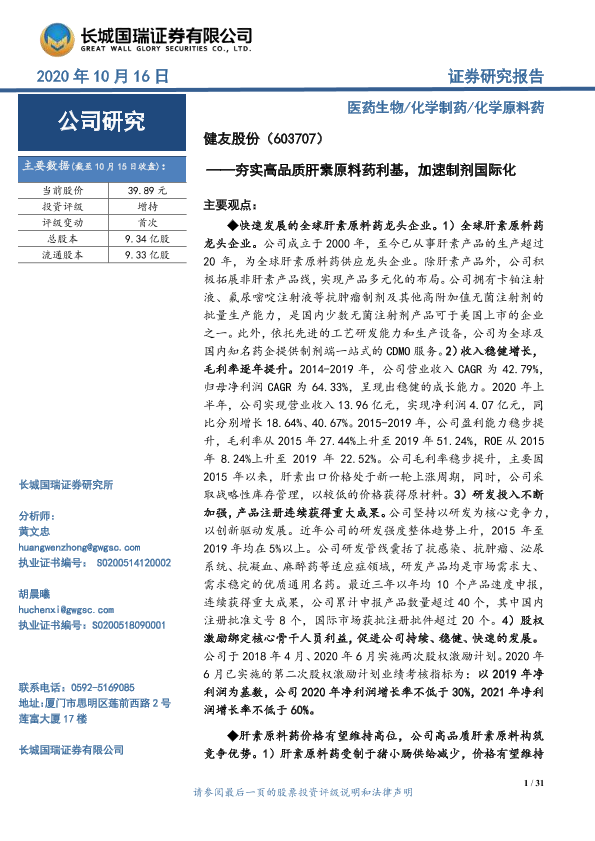 【长城国瑞证券】【20201016】夯实高品质肝素原料药利基,加速制剂国际化-31页