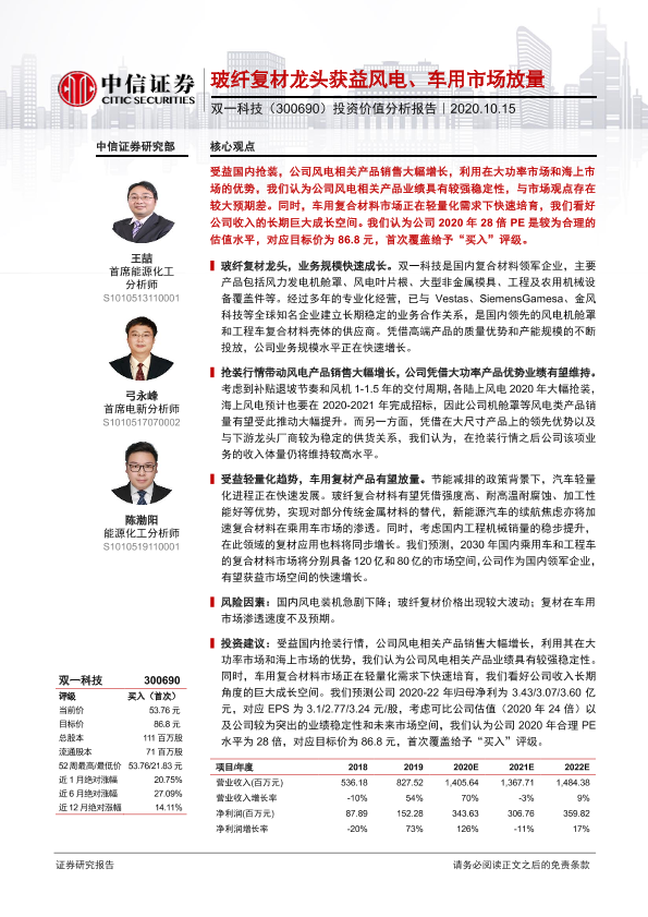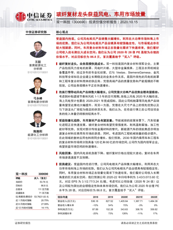 【中信证券】【20201015】双一科技-300690.SZ-投资价值分析报告:玻纤复材龙头获益风电、车用市场放量-23页
