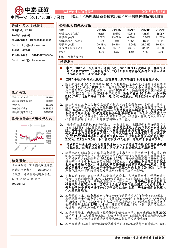 【中泰证券】【20201017】陆金所和蚂蚁集团业务模式比较和对平安整体估值提升测算-20页