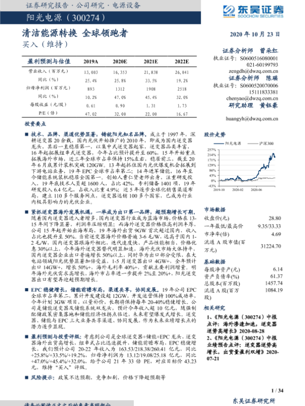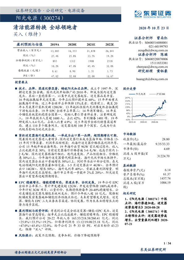 【东吴证券】【20201023】20201023-东吴证券-阳光电源-300274.SZ-清洁能源转换 全球领跑者-34页