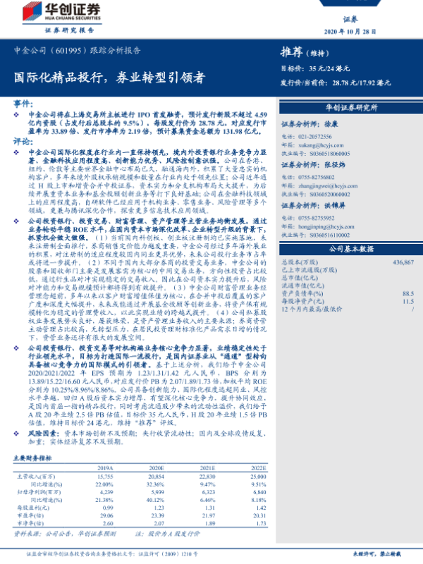 【华创证券】【20201028】20201028-华创证券-中金公司-601995.SH-跟踪分析报告:国际化精品投行,券业转型引领者-25页
