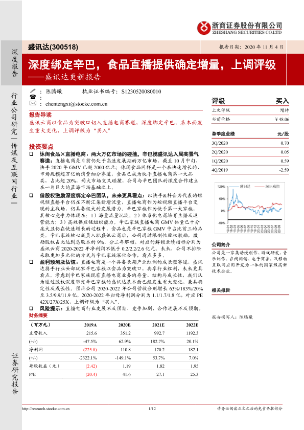 【浙商证券】【20201104】盛讯达更新报告:深度绑定辛巴,食品直播提供确定增量,上调评级-12页