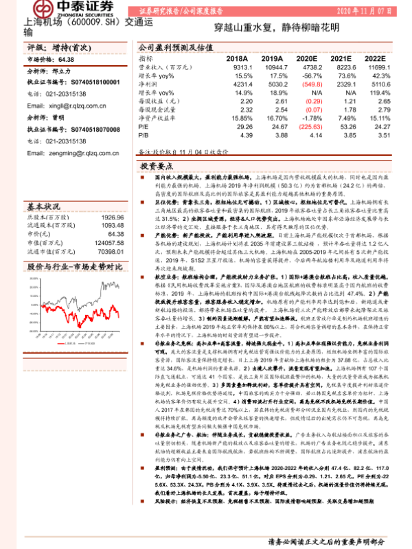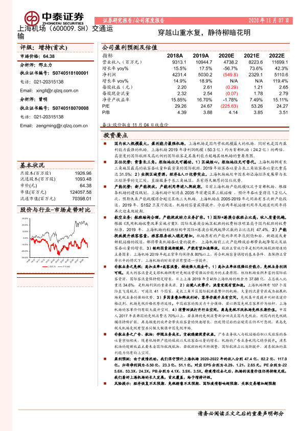 【中泰证券】【20201107】上海机场-600009.SH-穿越山重水复,静待柳暗花明-40页