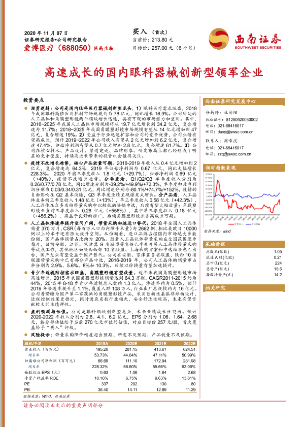 【西南证券】【20201107】20201107-西南证券-爱博医疗-688050.SH-高速成长的国内眼科器械创新型领军企业-22页