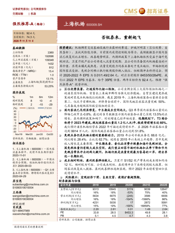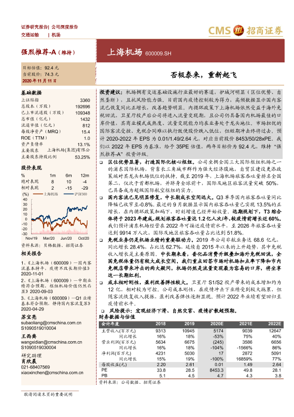 上海机场 交通运输 免税业务 复苏预测 疫情影响