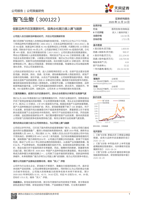 【天风证券】【20201114】20201114-天风证券-智飞生物-300122.SZ-创新品种开启发展新时代,强商业化能力插上腾飞翅膀-54页