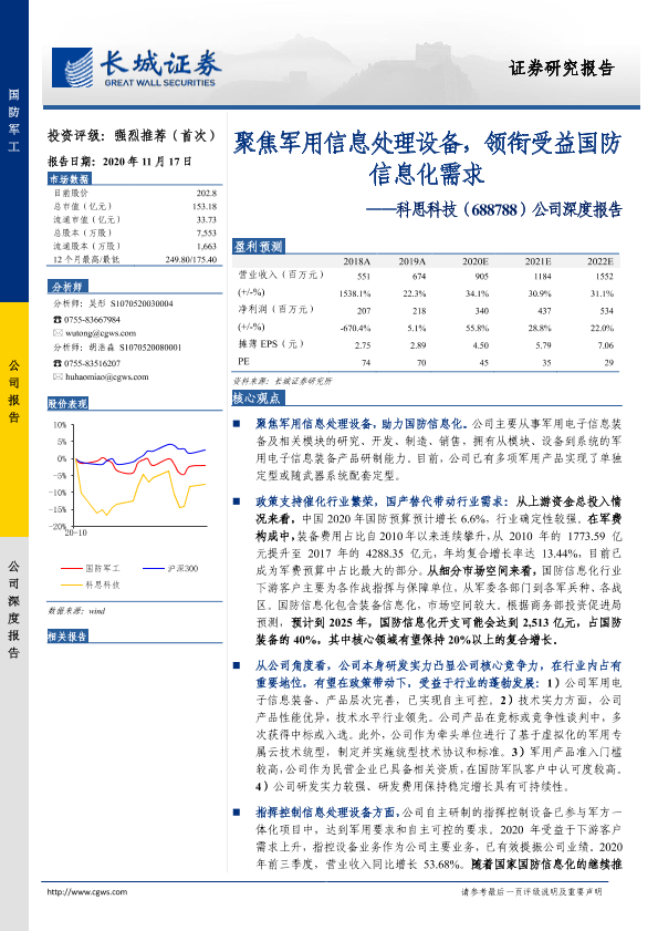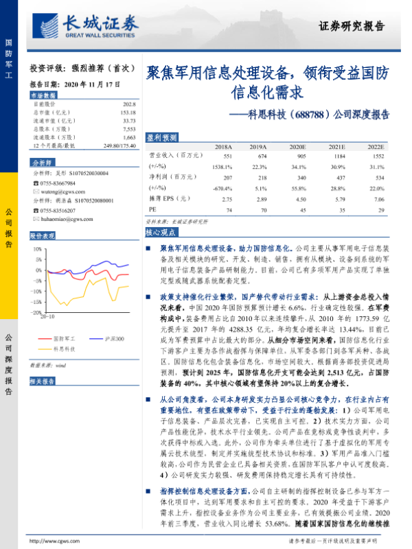 军用信息处理设备 国防信息化 科思科技 股票分析 长城证券