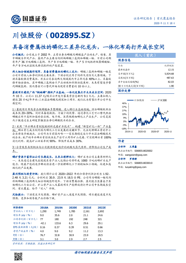 【国盛证券】【20201118】川恒股份-具备消费属性的磷化工差异化龙头,一体化布局打开成长空间-20页