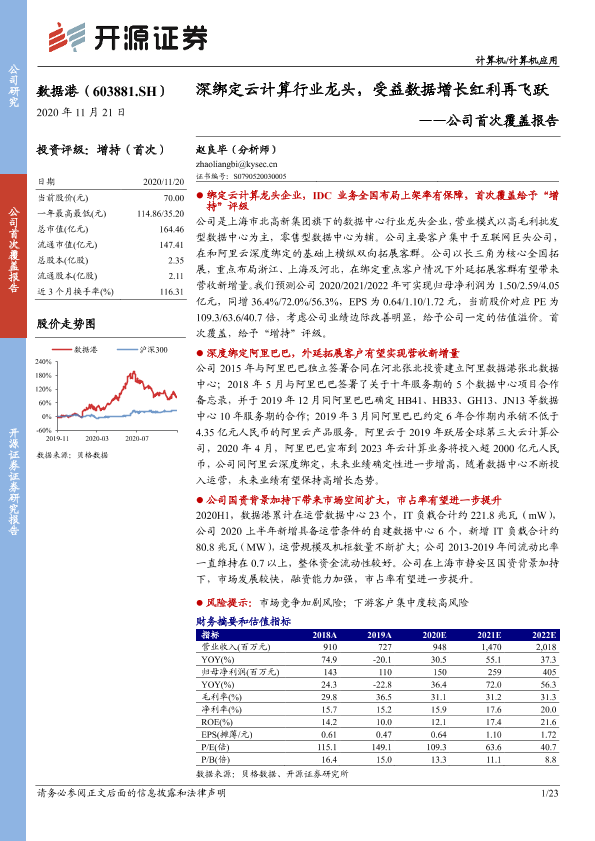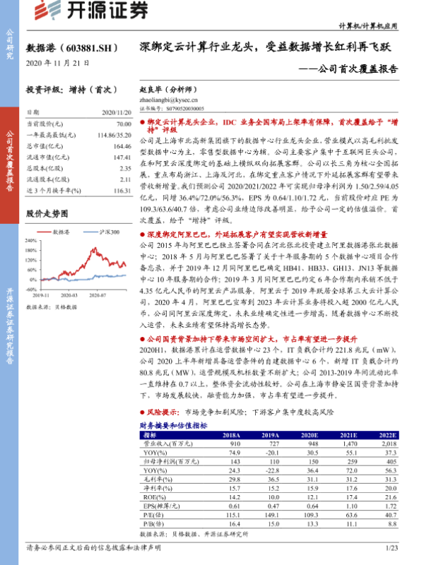 【开源证券】【20201121】数据港-603881.SH-公司首次覆盖报告:深绑定云计算行业龙头,受益数据增长红利再飞跃-23页