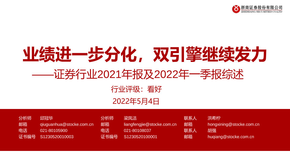 【浙商证券】【20220504】证券行业2021年报及2022年一季报综述:业绩进一步分化,双引擎继续发力-35页