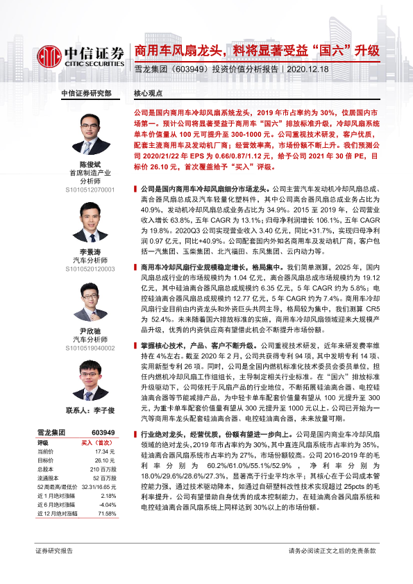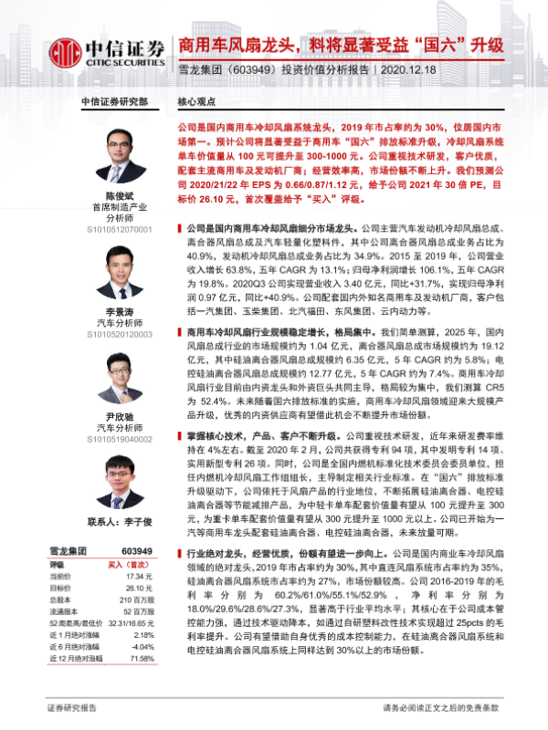 【中信证券】【20201218】20201218-中信证券-雪龙集团-603949.SH-投资价值分析报告:商用车风扇龙头,料将显著受益“国六”升级-20页