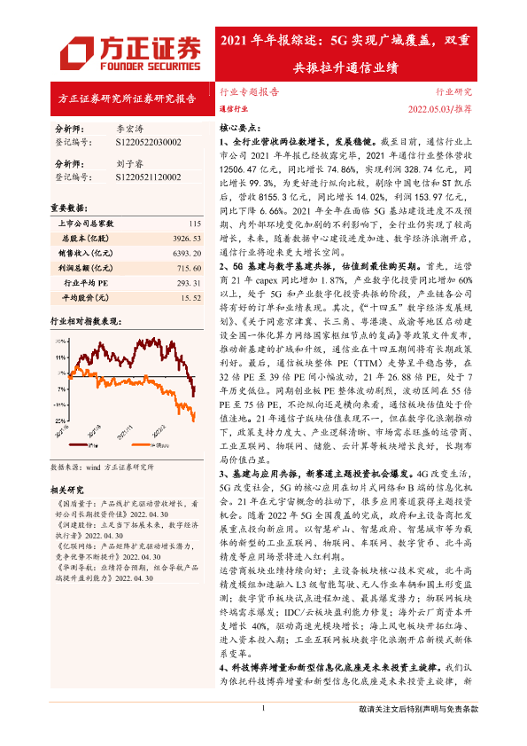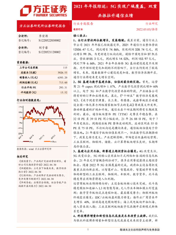 【方正证券】【20220503】通信行业2021年年报综述:5G实现广域覆盖,双重共振拉升通信业绩-42页