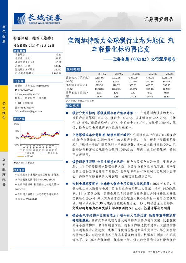 【长城证券】【20201222】云海金属-002182.SZ-公司深度报告:宝钢加持助力全球镁行业龙头地位 汽车轻量化标的再出发-28页
