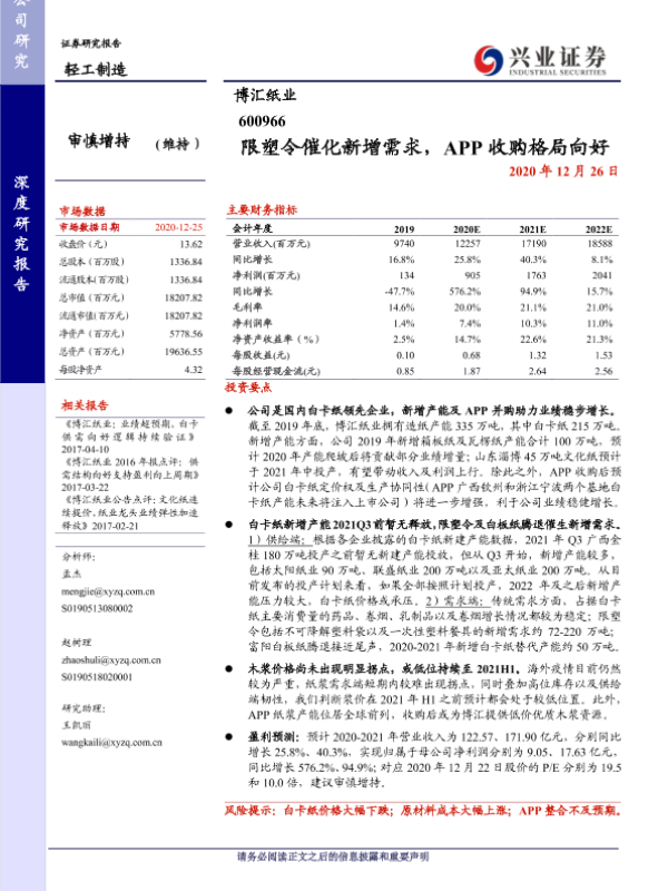 APP收购 业绩增长 博汇纸业 白卡纸 限塑令