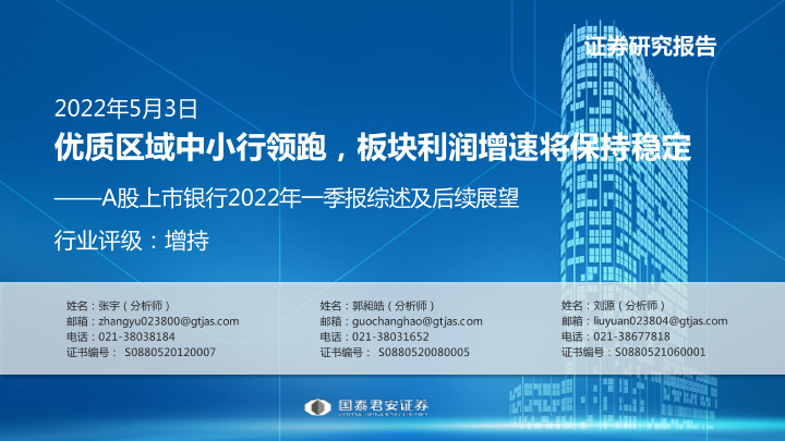 【国泰君安证券】【20220503】银行业A股上市银行2022年一季报综述及后续展望:优质区域中小行领跑,板块利润增速将保持稳定-42页