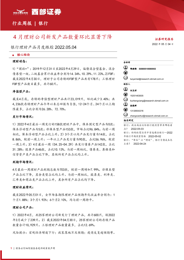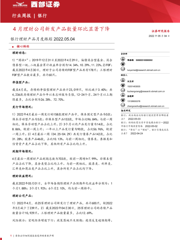 【西部证券】【20220504】银行业理财产品月度跟踪:4月理财公司新发产品数量环比显著下降-29页