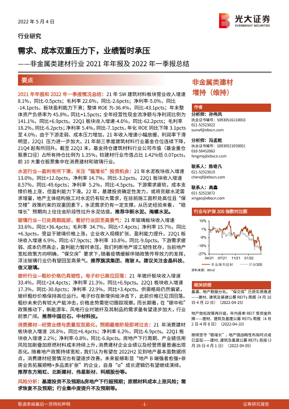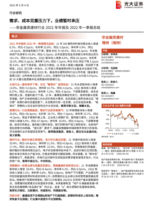 【光大证券】【20220504】非金属类建材行业2021年年报及2022年一季报总结:需求、成本双重压力下,业绩暂时承压-22页