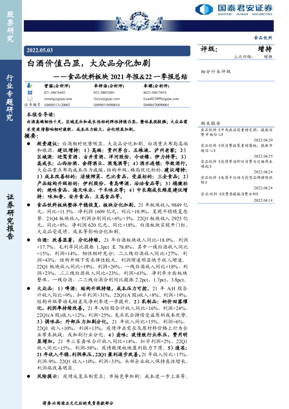 【国泰君安证券】【20220503】食品饮料行业板块2021年报&22一季报总结:白酒价值凸显,大众品分化加剧-49页