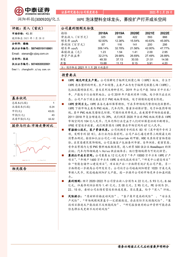 【中泰证券】【20210129】润阳科技-300920.SZ-IXPE泡沫塑料全球龙头,募投扩产打开成长空间-25页
