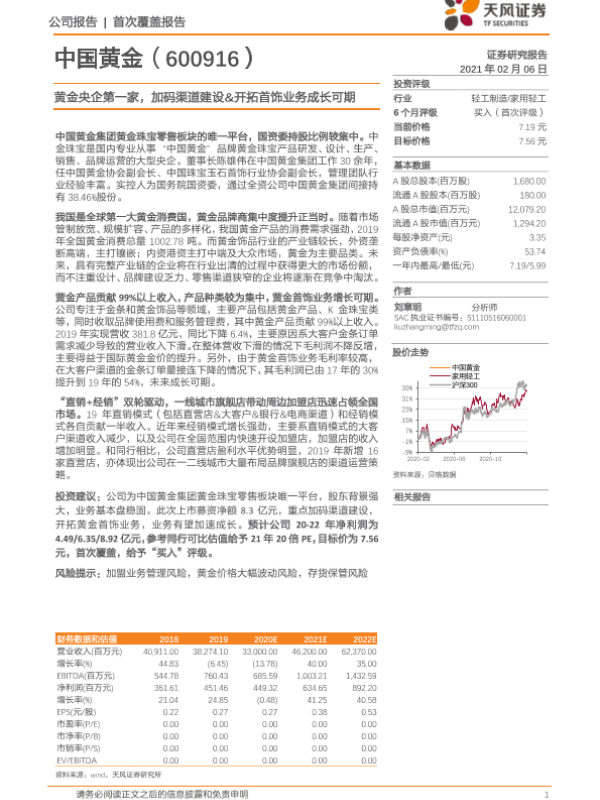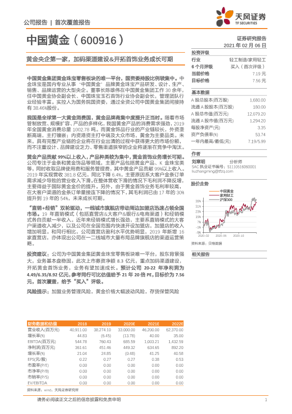 【天风证券】【20210206】中国黄金-600916.SH-黄金央企第一家,加码渠道建设&开拓首饰业务成长可期-26页