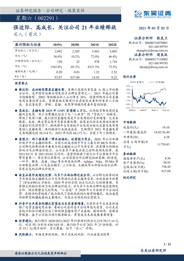 业绩预测 星期六 直播电商 转型 高成长