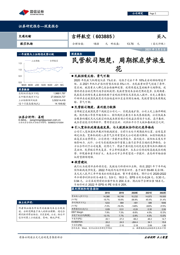 吉祥航空 周期探底 民航复苏 民营航司 盈利预测
